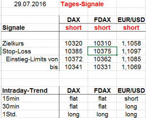 hier sind die täglichen Handelssignale für DAX und EURUSD. Passend dazu gibt es Einstiegs-Limits, einen Zielkurs und einen Stop-Loss. Sollte keine der vorgegebenen Kursgrenzen berührt werden, kommt noch einmal ein Zeit-Stopp hinzu. Wir schließen jede offene Position spätestens um 18:00 Uhr.
