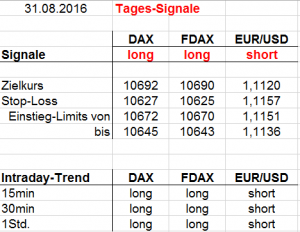 hier sind die täglichen Handelssignale für FDAX (DAX) und EUR-USD. Passend dazu gibt es Kursgrenzen (Einstiegs-Limits), einen Zielkurs und einen Stop-Loss. Sollte keine der vorgegebenen Kursgrenzen berührt werden, kommt noch einmal ein Zeit-Stopp hinzu. Wir schließen jede offene Position spätestens um 18:00 Uhr.