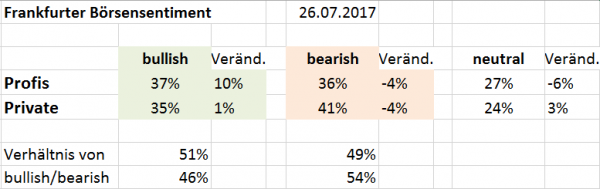 Jede Woche wird von der Frankfurter Börse eine Umfrage zur Börsenstimmung durchgeführt. Die Teilnehmer prognostizieren, wie sie den DAX-Stand in den folgenden vier Wochen einschätzen. An den Umfragen beteiligen sich circa 300 institutionelle und circa 600 private Marktteilnehmer. Es sind ausschließlich handelsaktive Marktteilnehmer. Im Gegensatz zu Analysten sind die Teilnehmer psychisch und materiell beeinflusst.