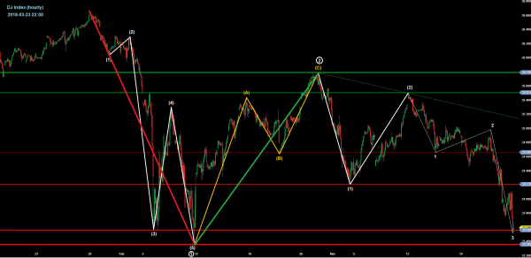 In der rechten Charthälfte sehen wir die Ende Februar am Widerstandslevel bei 25.800 Punkten einsetzende 3. Welle der Abwärtsbewegung. Die ersten beiden Unterwellen dieser Welle sind bereits abgeschlossen. Die an der Widerstandszone bei 25.500 Punkten beginnende 3. Unterwelle hat den Kurs in der vergangenen Woche um 1.400 Punkte fallen lassen und schickt sich nun an, ihre wiederum 3. Unterwelle abzuschliessen. Der Kurssturz der vergangenen Woche markiert in absoluten Punkten gerechnet die 3. schlechteste Woche der letzten beiden Jahrzehnte, nur noch übertroffen im September 2001 und im Oktober 2008.