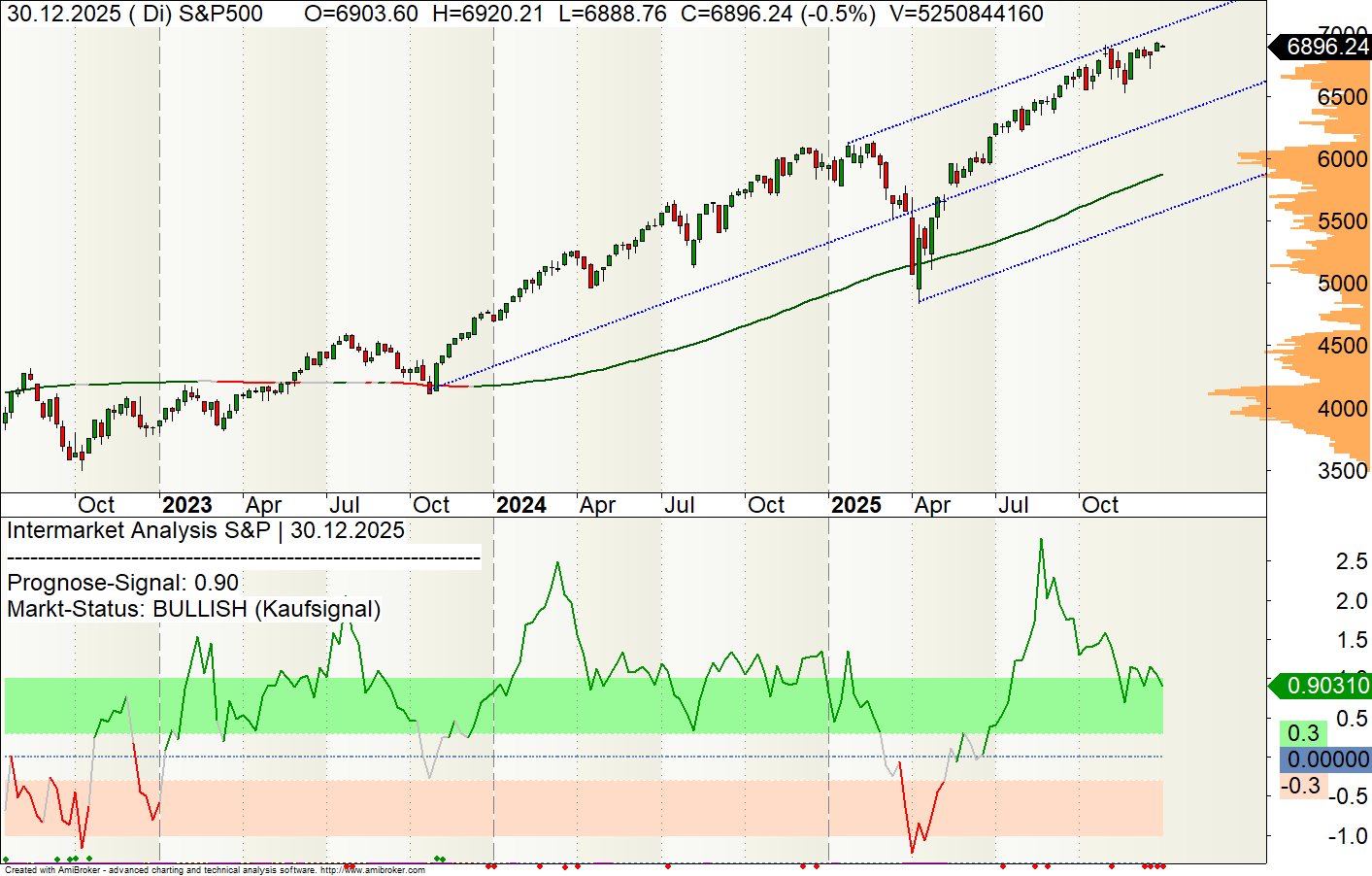Ergebnis: Grundsätzlich befindet sich der Intermarket-Indikator in einem bullishen Modus. Der aktuelle Trendkanal bietet Platz für eine Korrektur des S&P 500 um mehrere 100 Punkte. Der Bereich für mögliche Short-Positionen beginnt unterhalb der Nulllinie. Hiervon ist der Indikator mit einem Wert von 0,9 jedoch noch weit entfernt. Unabhängig davon, ob sich die Aktienmärkte zum Jahresstart nach oben oder unten entwickeln: Im Durchschnitt könnte jeder tiefere Kurs zum Einstieg für Long-Positionen genutzt werden.
