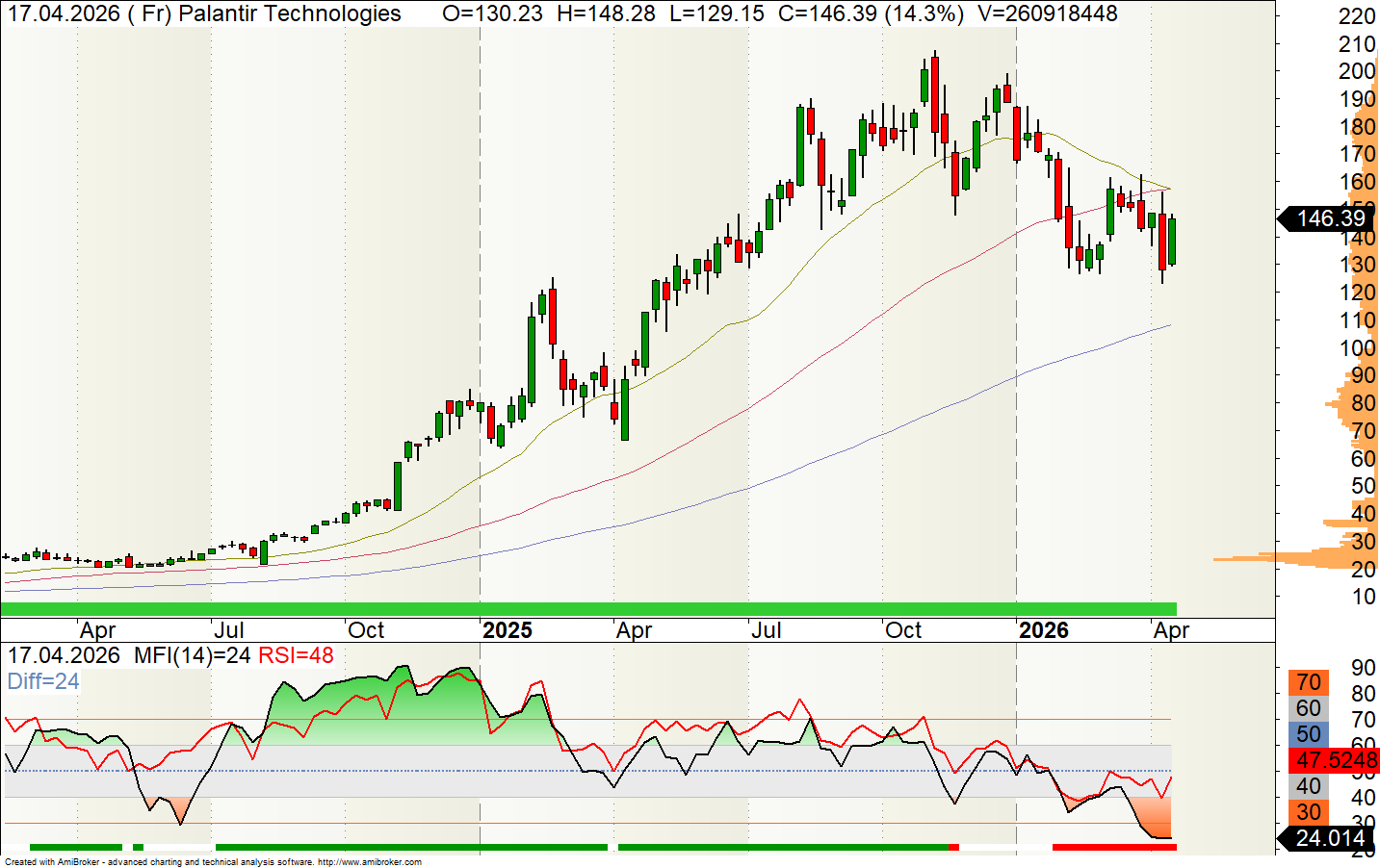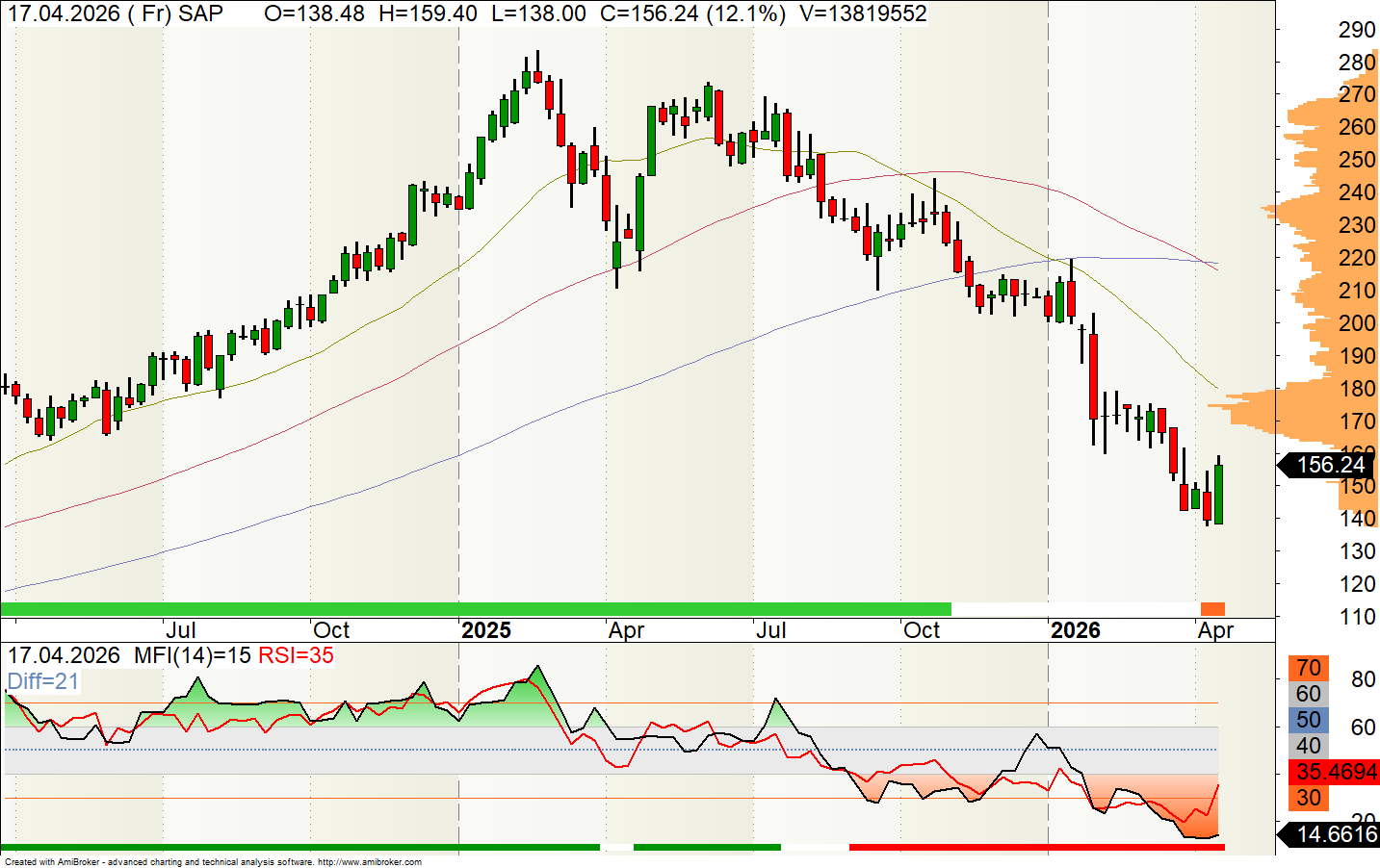Die monatelange Abwärtswelle sollte bei 140,01 Euro ihren Tiefpunkt erreicht haben. Der MFI deutet auf einen Erschöpfungszustand hin, sodass eine Gegenbewegung bis ca. 206 Euro möglich sein sollte.